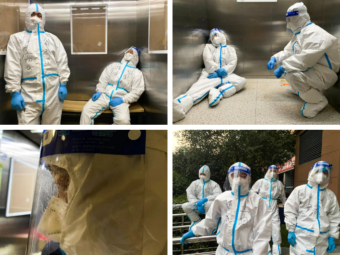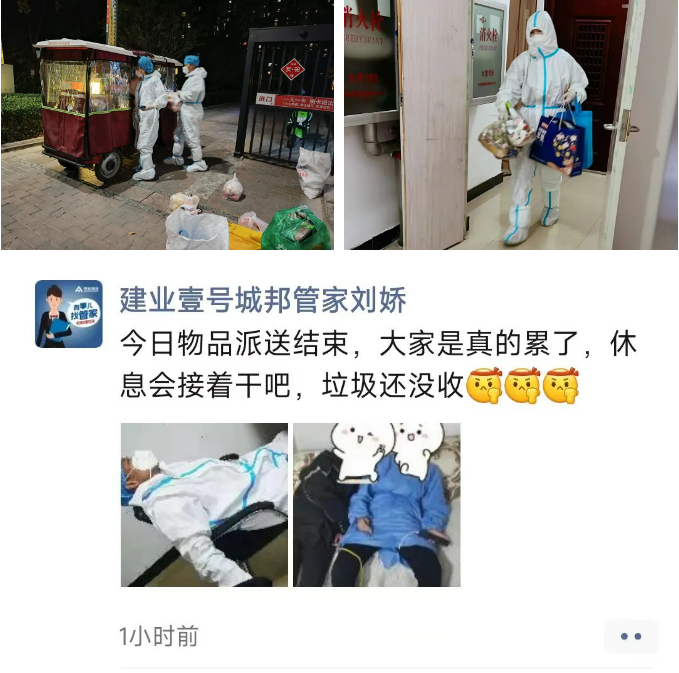 在封控的這段時(shí)間里,她每天都要走超過40000步。每天早上5點(diǎn)多,劉嬌嬌就要起床準(zhǔn)備,開始協(xié)同醫(yī)護(hù)人員進(jìn)行入戶核酸檢測(cè),與此同時(shí),細(xì)心的她還主動(dòng)詢問每戶業(yè)主的服務(wù)需求。樓道消殺、物資配送……忙完這些,稍作休息,她還要再逐戶清收生活垃圾,等拖著一身的疲憊躺在辦公室的地鋪上時(shí),往往已是午夜。