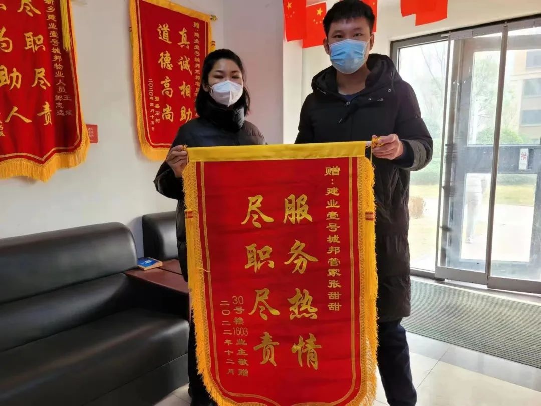 “鼎力相助,有求必應(yīng)” “排憂解難,情系業(yè)主” “服務(wù)熱情,盡職盡責(zé)” …… 12月8日,剛剛解封不久的新鄉(xiāng)·建業(yè)壹號城邦物業(yè)服務(wù)中心內(nèi),業(yè)主代表們將21面鮮紅的錦旗送給了貼心管家張?zhí)鹛穑瑢λ谝咔榉饪仄陂g的無私奉獻(xiàn)及日常服務(wù)中的盡職盡責(zé)表達(dá)感謝。 是她的負(fù)責(zé),保障了我們特殊時(shí)期的安全 在前段時(shí)間的疫情管控中,張?zhí)鹛鹚?fù)責(zé)的樓棟內(nèi)出現(xiàn)了確診病例,按照當(dāng)時(shí)的政策,需要對整個(gè)單元進(jìn)行封控,張?zhí)鹛鸨愠袚?dān)起整個(gè)樓層的消殺、物資配送等工作。在配送物資時(shí),張?zhí)鹛鸢l(fā)現(xiàn)有的業(yè)主并沒有按照防疫要求足不出戶,便主動勸導(dǎo)業(yè)主進(jìn)行嚴(yán)格的居家隔離,避免病毒進(jìn)一步擴(kuò)散。 與此同時(shí),張?zhí)鹛疬€時(shí)刻關(guān)注著被感染業(yè)主的健康情況,在被感染